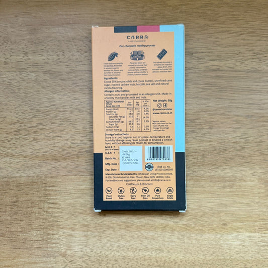 CARRA Cashews & Biscotti 50g Bar 55% Dark Chocolate