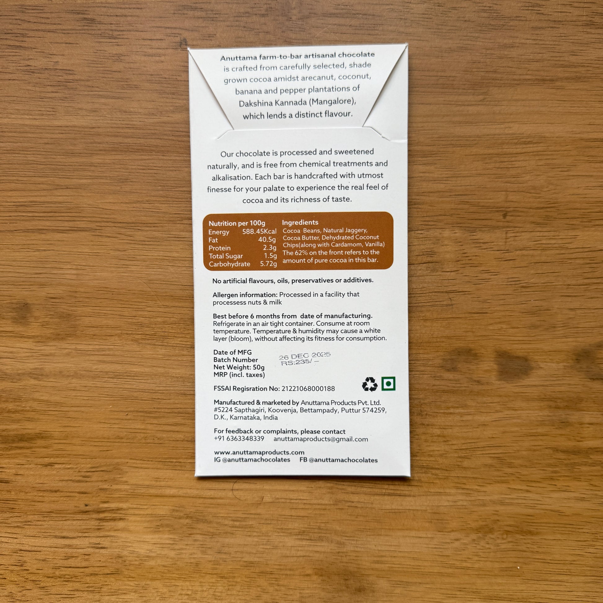 Anuttama 62% Dark Chocolate with Coconut chips